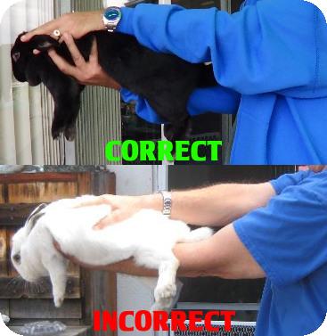 他告訴我,(從兔之空間 (BunSpace) 傳遍網路的)第一組照片的抱法就是錯誤的抱法,可能讓兔子的背部或頸部受傷。請看兔佬好意提供的照片及資訊。示範兔子為瞪眼