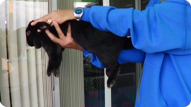 他告訴我,(從兔之空間 (BunSpace) 傳遍網路的)第一組照片的抱法就是錯誤的抱法,可能讓兔子的背部或頸部受傷。請看兔佬好意提供的照片及資訊。示範兔子為瞪眼